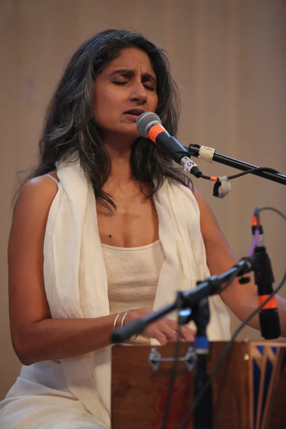Nina learned traditional chants (bhajans) from her grandfather in a village in south India when she was nine years old. The chants quietly stayed with her until she rediscovered chanting with Krishna Das in New York in 1996. In 1998 she met her guru, Sri Siddhi Ma in the foothills of the Himalayas and spent time with her regularly for 19 years. Her childhood was spent living in and moving between many countries around the world. She transitioned from the banking world into organizing and leading photographic wildlife safaris in Africa and India, and now since 1996, is Krishna Das' business manager and accompanist, as well as chant leader on her own.